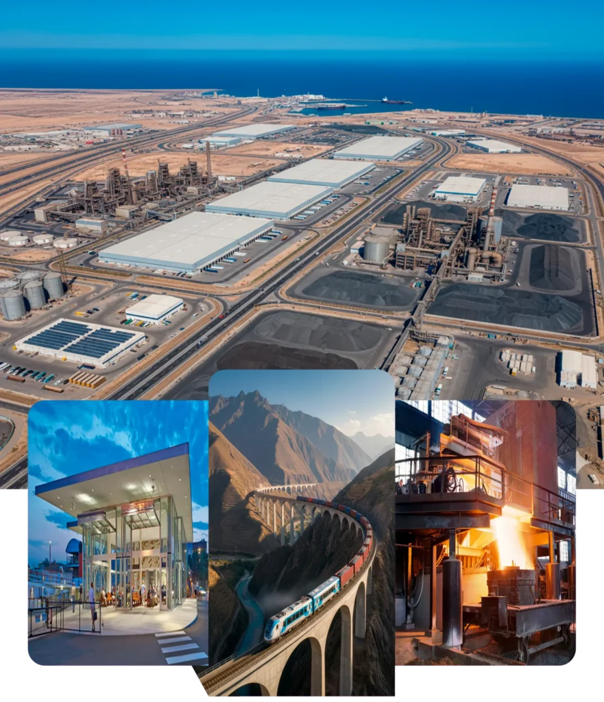 La infraestructura destaca por un tren minero de 656.25 km que conecta Lambayeque con Cajamarca, Amazonas y Loreto, diseñado con tracción eléctrica y tecnología de autopista ferroviaria. Este corredor facilita la producción y transporte de bienes estratégicos como hierro esponja, pellets de hierro y ferro-aleaciones, integrando el modelo Rail + Property para desarrollar centros comerciales y hoteles en el entorno de sus estaciones de tráfico mixto.